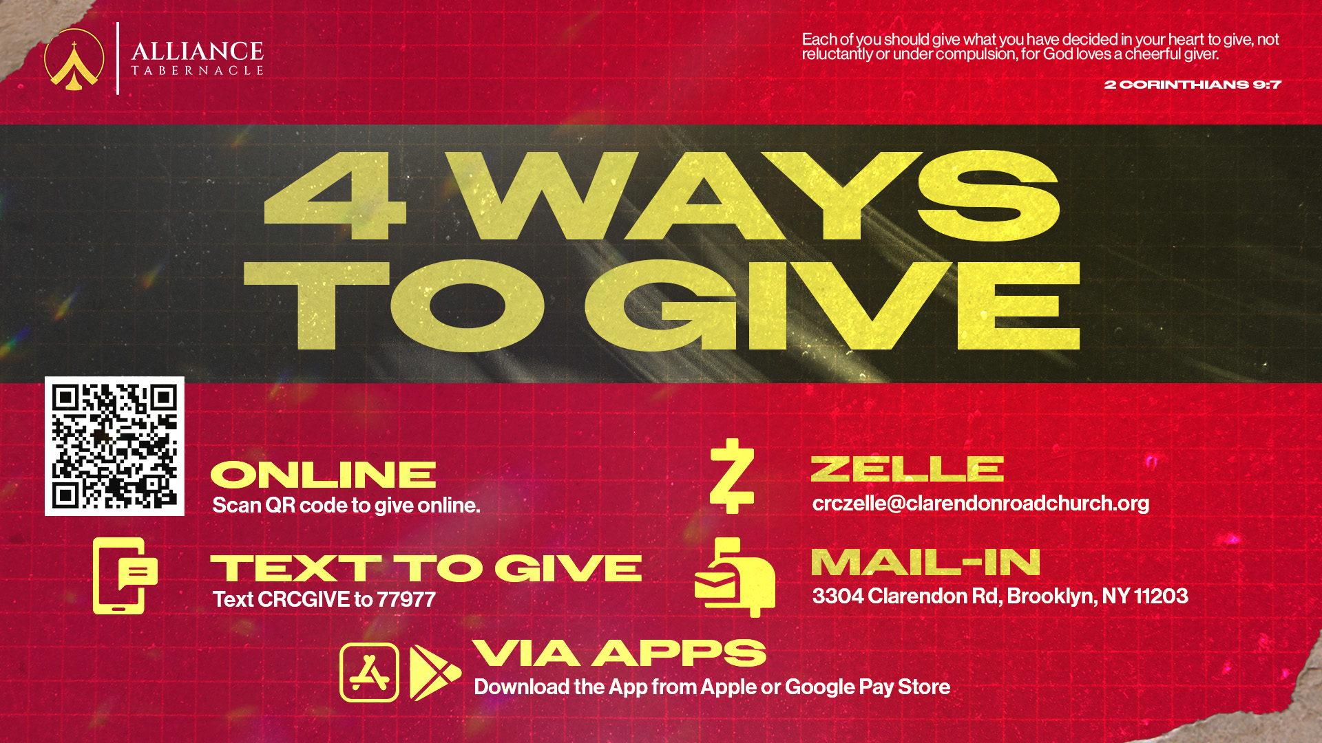 At Alliance Tabernacle Church, giving is an act of worship, obedience, and gratitude. Your generosity helps us continue the mission God has entrusted to us—to be a church with deep roots, new branches, bearing fruit in the name of our Lord Jesus Christ. Every gift you sow directly supports the ongoing work of ministry within our congregation and the broader Brooklyn community. From Sunday worship to community outreach, youth mentorship to digital ministry, your faithful contributions make it all possible.